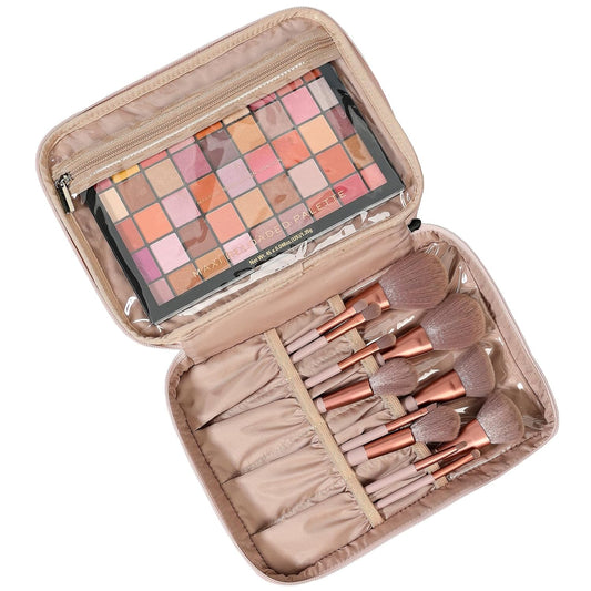Large Double Layer Travel Makeup Bag Women, Cosmetic Case, Organizer for Travel-Size Accessories Bottles, Brushes, Conditioner, and Skin Care Products, Pink